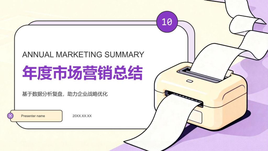 标签:媒体咨询,插画风,工作总结,紫色,年终总结年度市场营销总结,基于数据分析复盘,呈现市场趋势、策略成效与改进方向,助力企业战略优化。